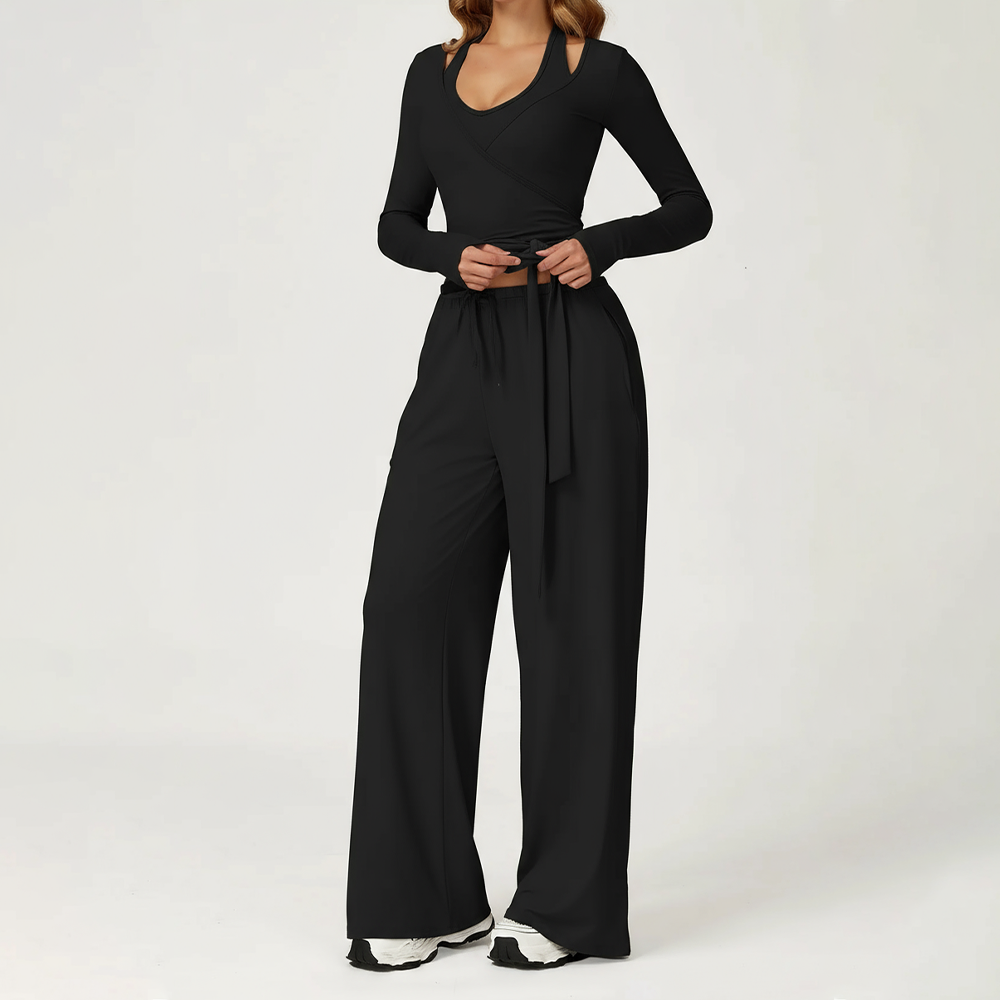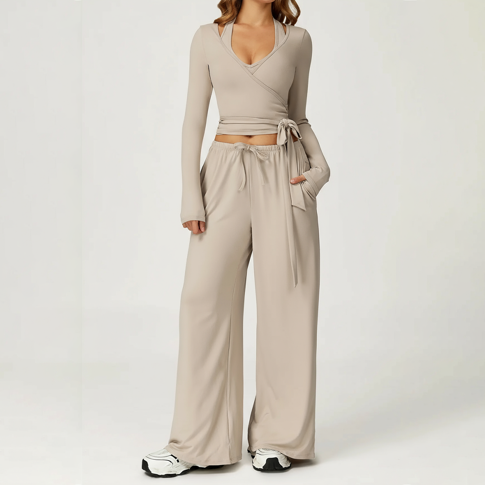 Top crop sophistiqué : Disponible en version manches longues enveloppantes avec détail noué à la taille, ou en version débardeur dos nageur pour un look plus audacieux